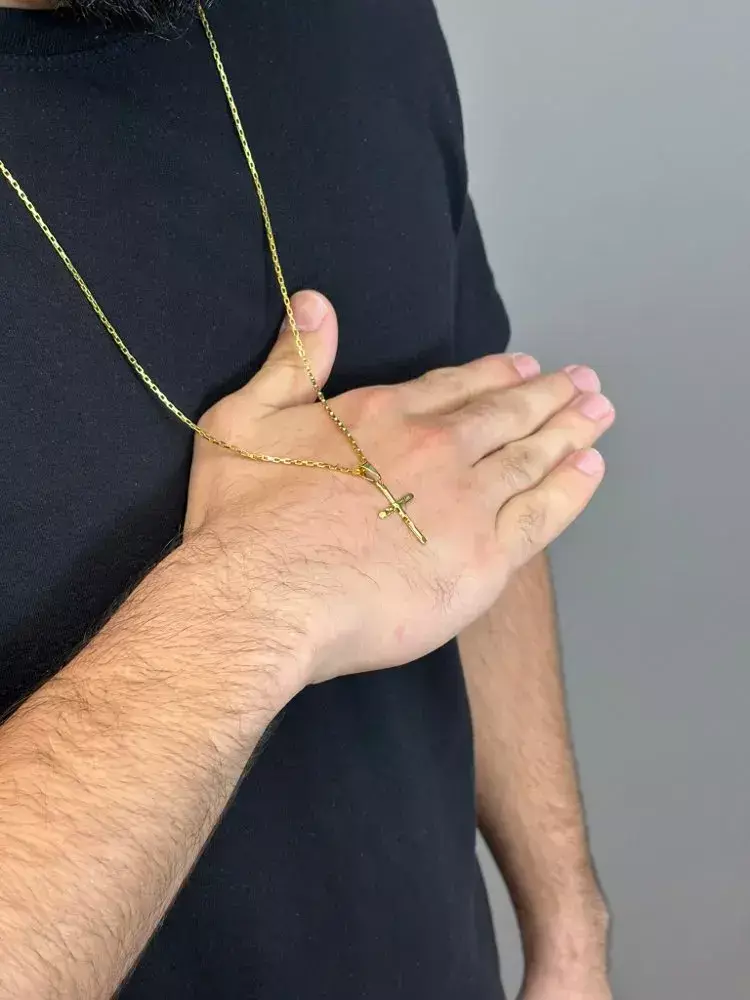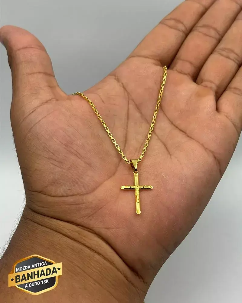 CORRENTE TIJOLINHO 1,5MM - 70CM + PINGENTE CRUZ PONTEADA COM CRISTO (BANHADO A OURO 18K)